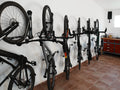 Jack has a total of eight racks installed. He has spaced them all 600mm apart which allows him to pivot the racks against the large wall space that he has. It also means that Jack can sort through his collection of bikes with ease to access the bike he wants to ride.