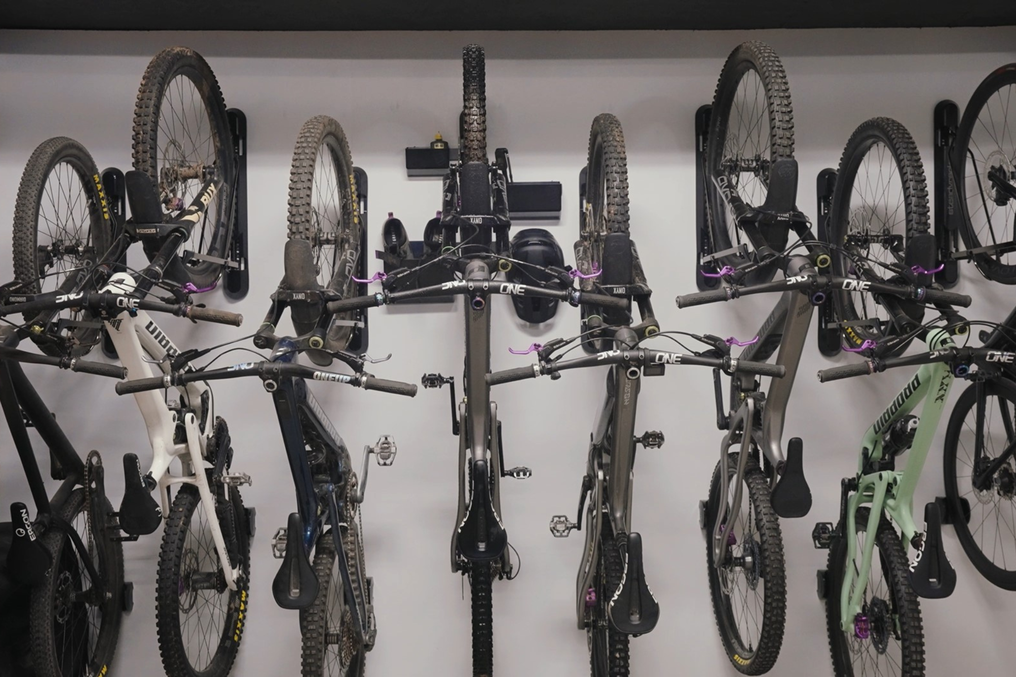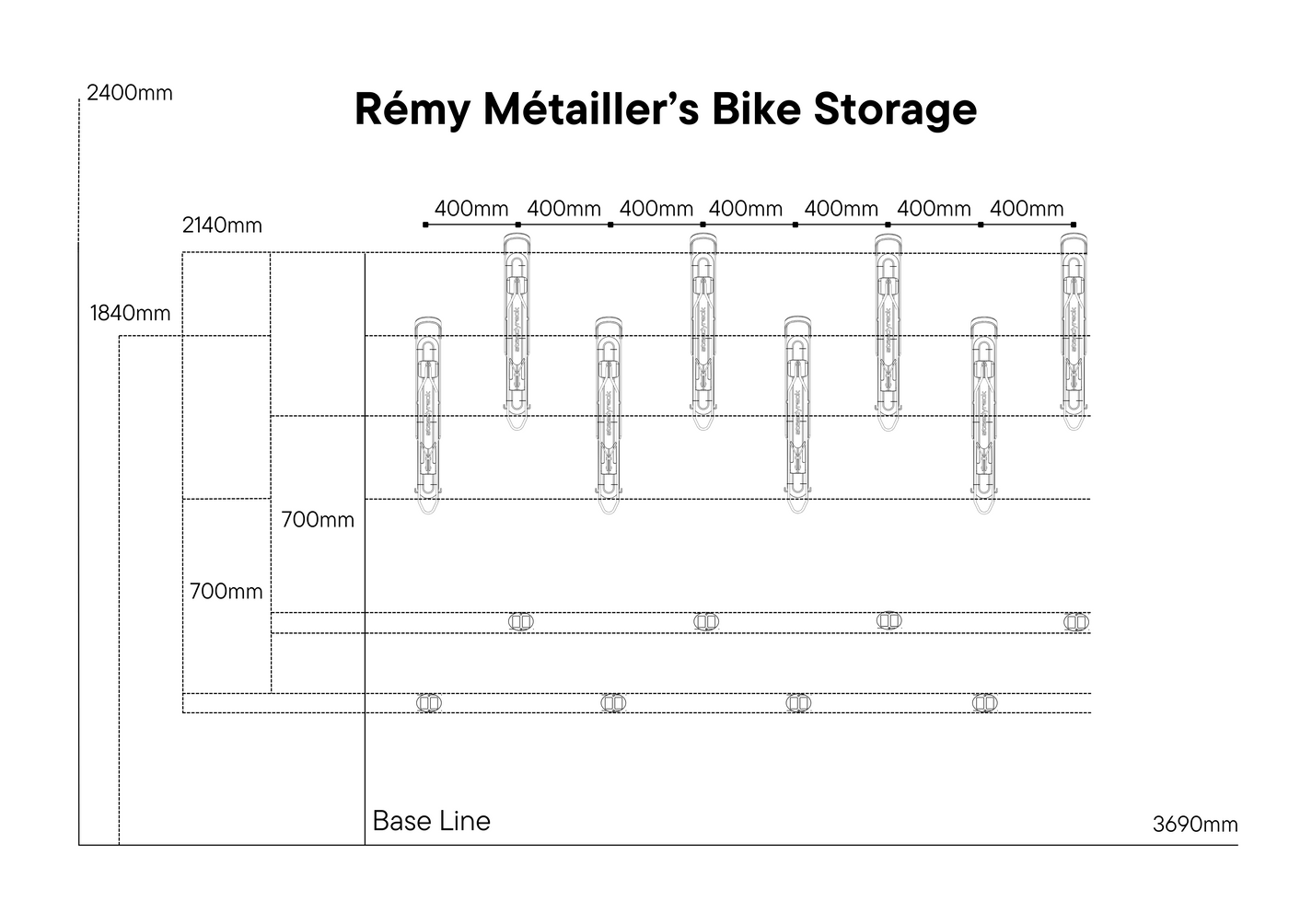 Rémy has spaced his bikes 400mm apart and has hung them at alternating heights to get even more bikes into a small space. He has 8 bikes in ProFlex Racks. Loading his bikes in this manner means he can get more out of a tight space whilst still being able to pivot them side to side to access the bike he wants to ride.